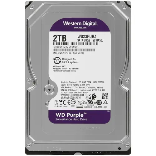 Жесткий диск WD Purple WD23PURZ имеет объем памяти в 2 ТБ и обеспечивает создание коллекции фильмов, фотографий, документов, приложений. Пропускная способность интерфейса SATA III составляет 6 Гбит/с. Скорость вращения шпинделя 5400 об/мин делает работу диска практически бесшумной и экономит электроэнергию. WD Purple WD23PURZ имеет технологию RAID Edition и гарантирует сохранность данных даже при отказе одного из дисков.